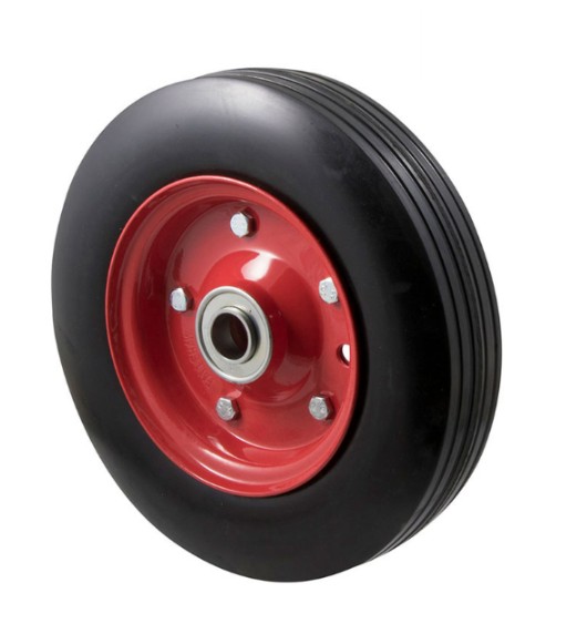 Puncture-proof solid-cushioned wheel, 280x70mm black rubber tyre, split rim, steel center, deep groove bearing 1 inch ID, 200kg capacity.